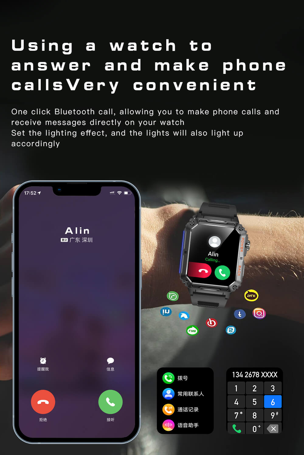 Stopwatch,,World Clock,Find Phone, 100+ Sports Mode, Calculator, etc